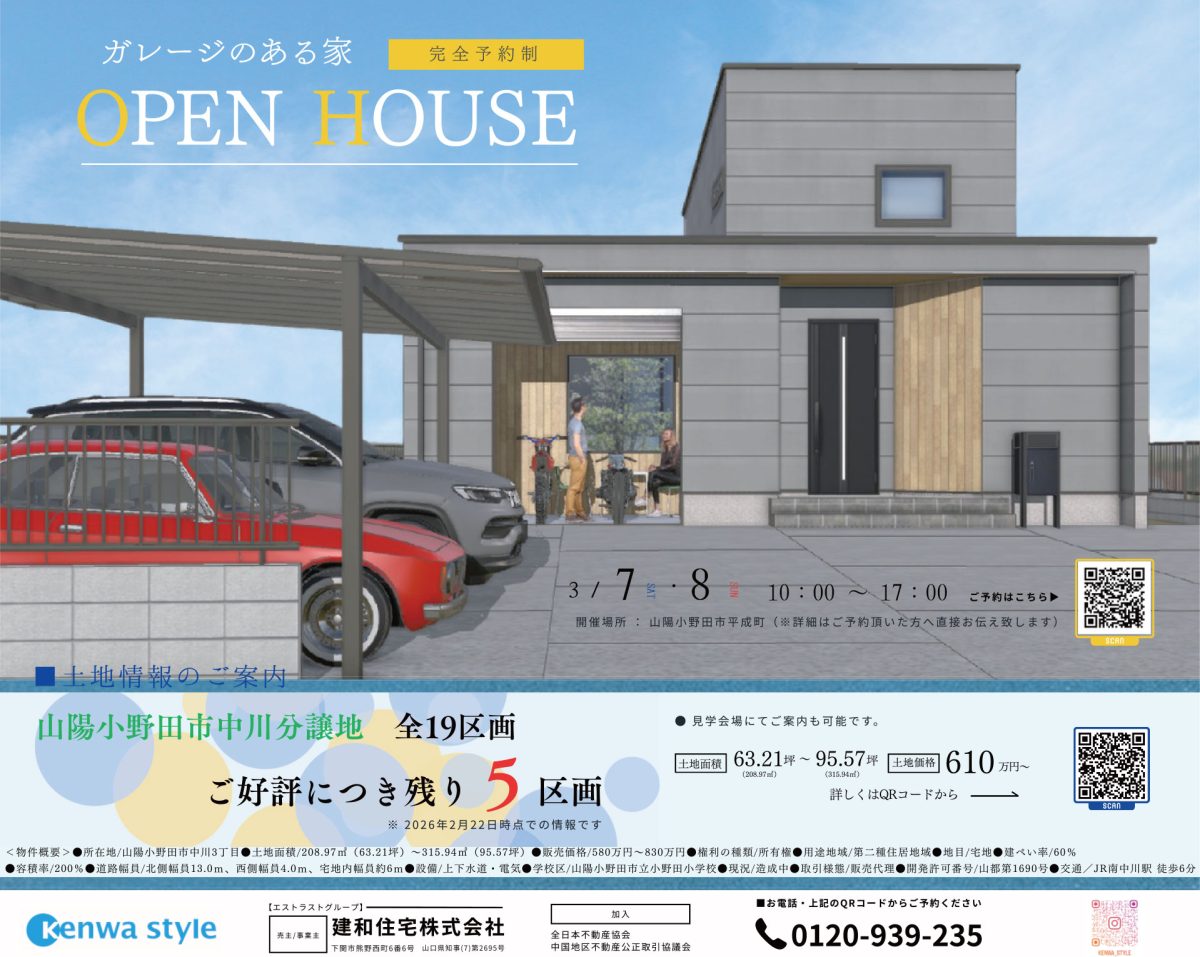 【見学会】3/7・8 ガレージのある家 OPEN HOUSE 建和住宅株式会社【山陽小野田市】