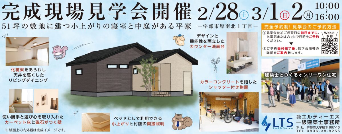 【見学会】2/28・3/1・2 51坪の敷地に建つ小上がりの寝室と中庭がある平家 エルティーエス【宇部市】