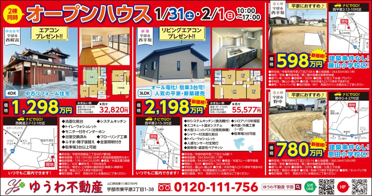 新着情報 【見学会】1/31 – 2/1 2棟同時オープンハウス開催! ゆうわ不動産【宇部市】 2026年01月30日 2棟同時開催!オープンハウス開催! 【日時】1月31日(土)〜2月1日(日) 10:00〜17:00 【場所】宇部市東梶返・宇部市西平原 【お問い合せ】0120-111-756またはWebサイトまで 最新記事 【見学会】1/31 – 2/1 2棟同時オープンハウス開催! ゆうわ不動産【宇部市】 2026年1月30日 【見学会】1/31 – 2/1 新価格!オープンハウス開催! 株式会社ひとまちライブラリー【宇部市】 2026年1月30日 【見学会】随時内覧可!平屋建売住宅オープンハウス アートビー【宇部市】 2026年1月30日 【見学会】1/30 – 2月末 工務店社長の自宅公開! ルナホーム【山口市】 2026年1月30日 【見学会】1/31 – 2/8 OPEN HOUSE 株式会社大徳建設【山陽小野田市】 2026年1月23日